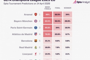 OPTA预测晋级概率:拜仁83.4%,阿森纳88%,皇马16.6%,葡体12%